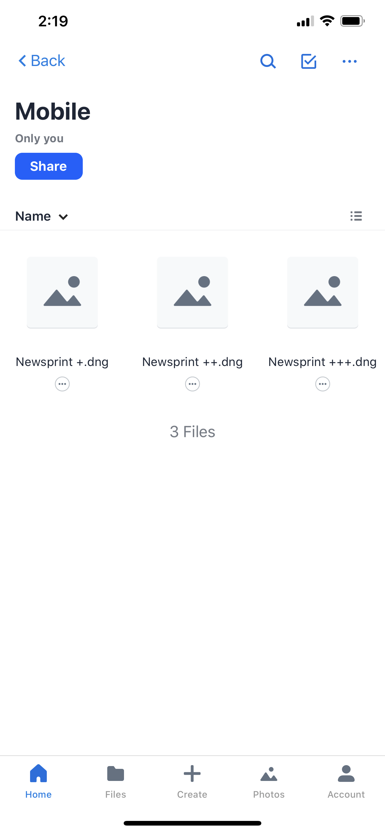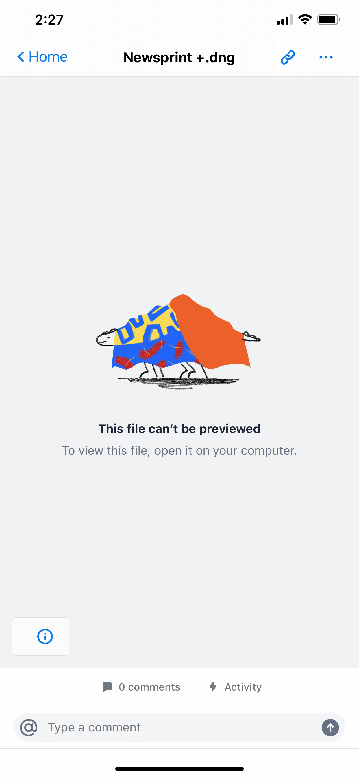 Now, we want to import these .dng files into our phone. Access the Mobile folder through the Dropbox app on your phone and click on the first .dng file. You will see a prompt saying “This file can’t be previewed”.