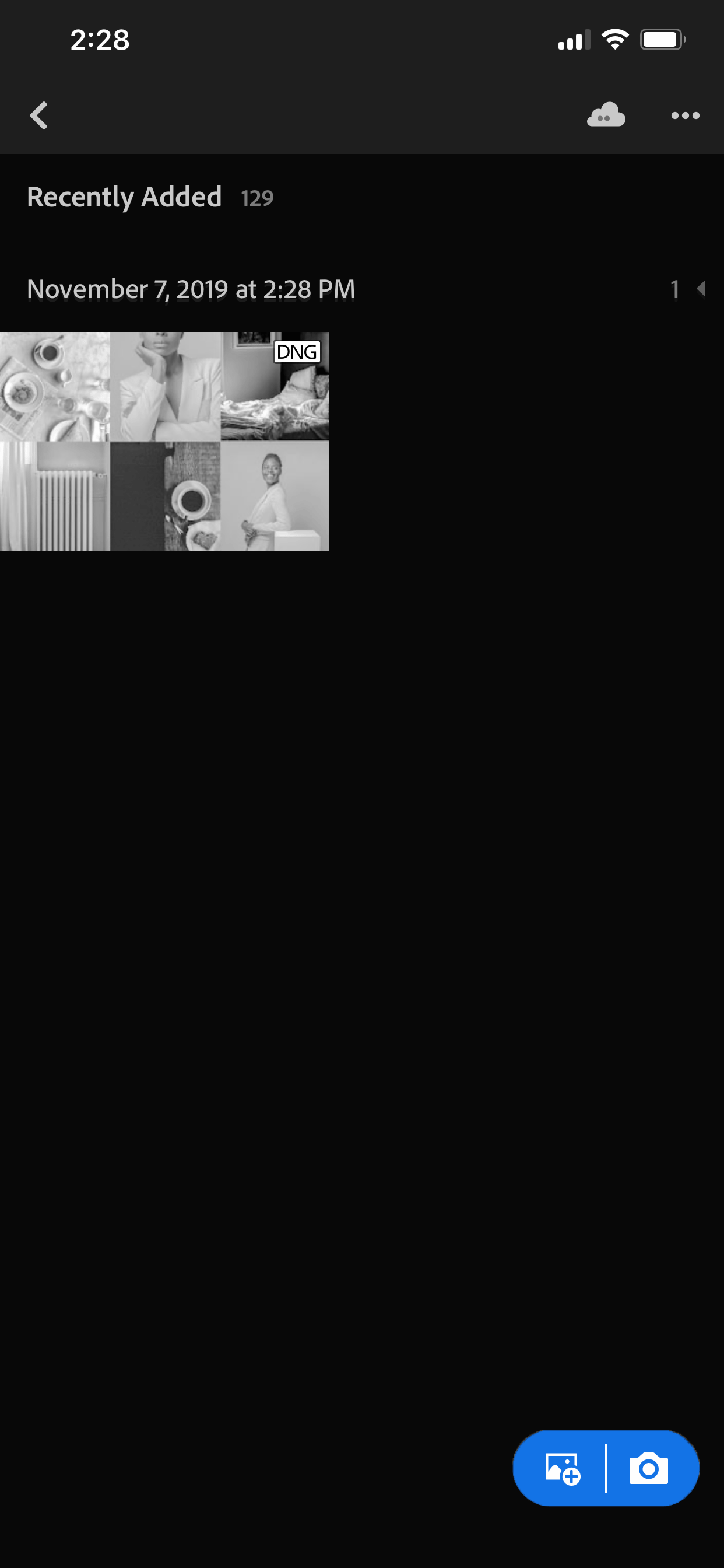 Now, open the Lightroom app. The .dng files should appear under Recently Added. If not, locate the .dng files by clicking on the blue Add Photo icon at the bottom and select From Camera Roll. Select the files. Click Add. The files have now been added to your Lightroom image library.