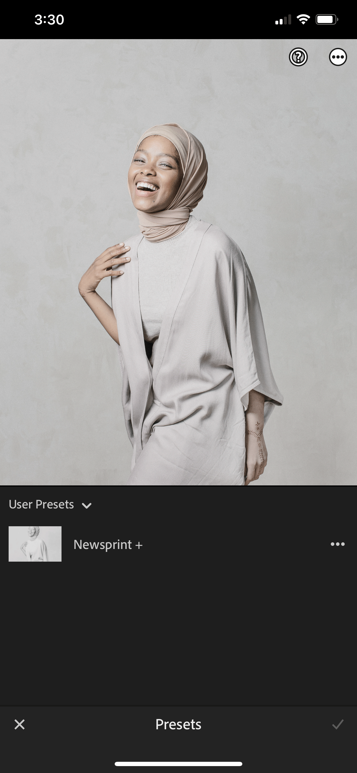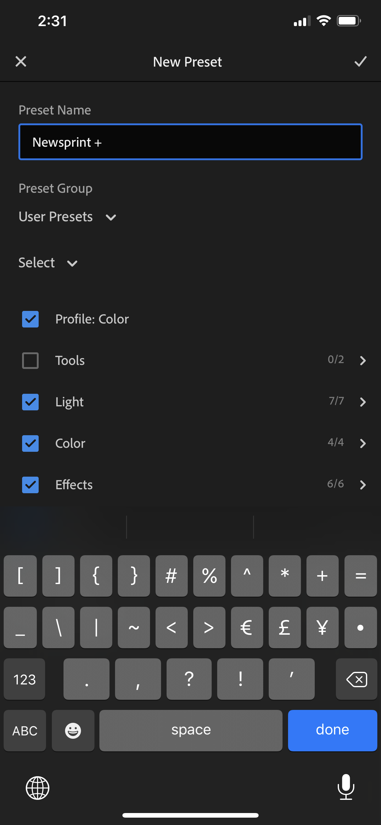 Select Presets from the bottom bar. Scroll down to User Presets. Here you will find your new preset. Tap on the preset name to apply and click on the check mark to apply the changes.